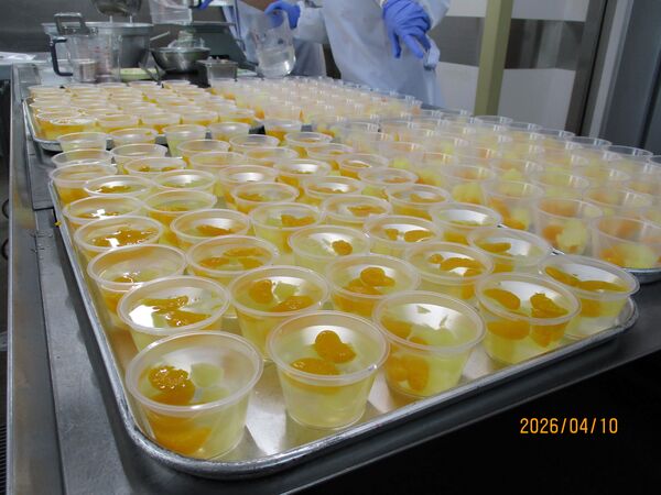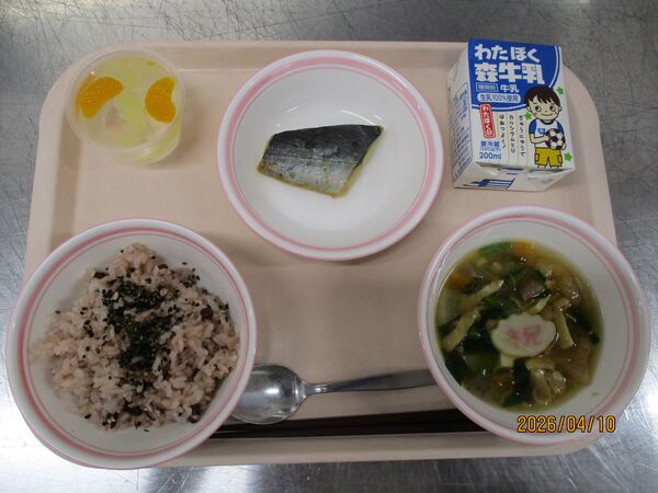 *新学期の給食が始まりました。みなさんの進級をお祝いして、赤飯とお祝いかまぼこが入ったけんちん汁が登場しました。
