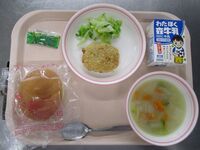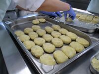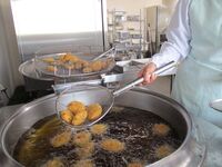 *今日は手作りコロッケが登場しました。生地を成形し、パン粉をつけて油で揚げます。外はサクサク、中はホクホクにおいしく仕上がりました。