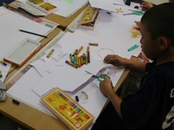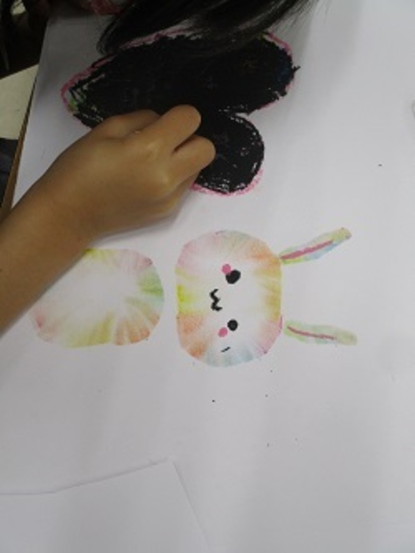 「クレヨンパスでらんらんランド」という題材で、クレヨンを指でこすって、きれいな色を出していました。お日様のように外向きにこすったり、○の中に内向きにこすったり、工夫しながら楽しく活動していました。