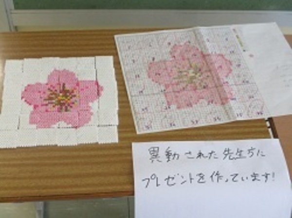 離任式に来るお世話になった先生にプレゼントするアイロンビーズを協力して作っていました。一人ひとりが分担して小さなプレートを作り、合体して大きなプレートにするようです。出来上がりが楽しみですね。