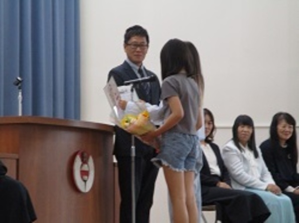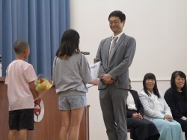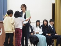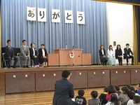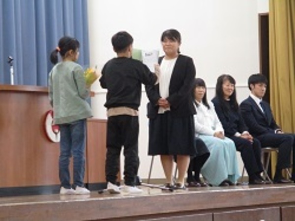 転出された8名の先生方をお迎えし、離任式を行いました。子どもたちは、お手紙と花束をお渡ししたあと、先生方お一人おひとりのお話に、嬉しそうに耳を傾けていました。 離任式後のお別れの会では、教室などで温かい時間を過ごす姿が見られました。