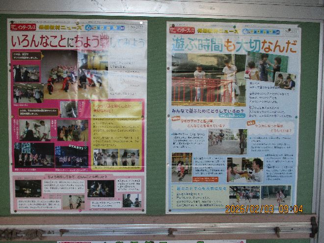 | 1階の掲示板では、いつもタイムリーな保健に関するニュースが掲示されています。保護者の皆さまも、ぜひご来校の際にご覧ください。 | |