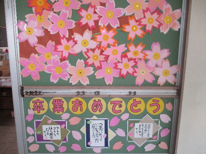 | 学校の掲示コーナーは卒業を祝う素敵な掲示が続々と出現しています。保健室からもお祝いのメッセージが届けられました。 | |