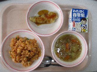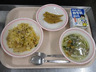 2月17日(火) キムたくチャーハン 牛乳 きびなごのカリカリフライ マーラータン |