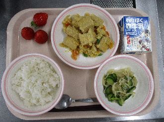 2月12日(木) むぎごはん 牛乳 なまあげのたまごとじに だいこんのピリからあえ いちご |