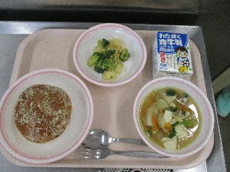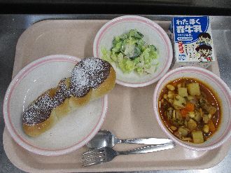 2月19日(木) てづくりカレーパン 牛乳 とうふのスープに ブロッコリーといものごまチーズあえ |