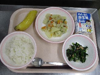 2月16日(月) むぎごはん 牛乳 うましおにくじゃが こまつなのりあえ バナナ |