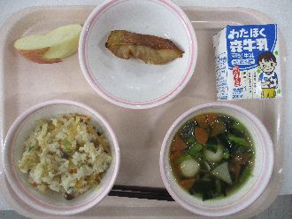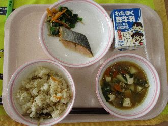 2月18日(水) たきこみごはん 牛乳 しゃけのしおやき とんじる おひたし |