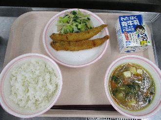 2月26日(木) むぎごはん 牛乳 ししゃもキムチフライ みそけんちんじる なめたけあえ |