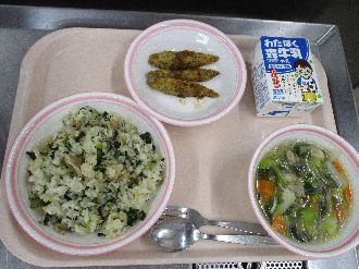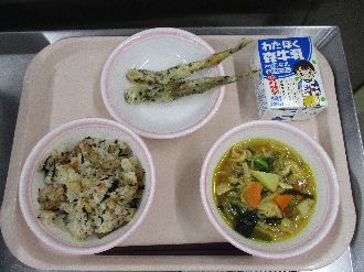 11月7日(金) かみかみごはん 牛乳 ししゃものいしがきあえ きりぼしだいこんのみそしる |