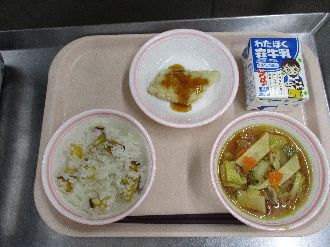 11月11日(火) さつまいもごはん 牛乳 さわらのかぼしすソースがけ にぼうとう |