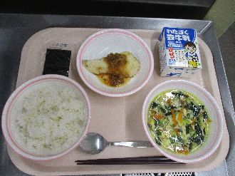 11月25日(火) むぎごはん 牛乳 ホキのかんこくやくみソース ちゅうかたまごスープ かんこくのり |