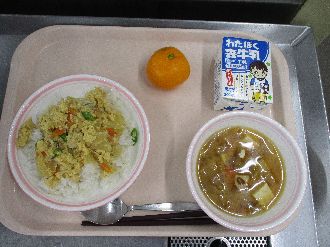 11月27日(木) カリーノケールのチャーハン 牛乳 きびなごおちゃフライ はくさいスープ |