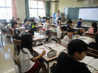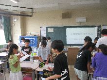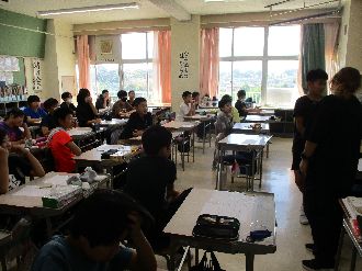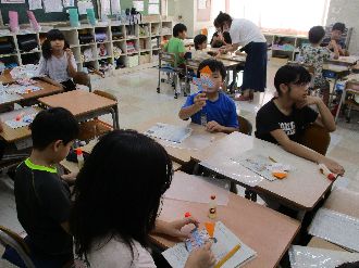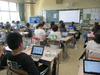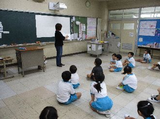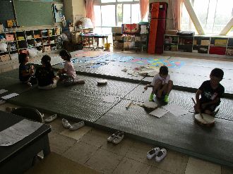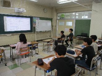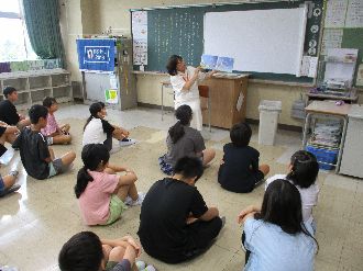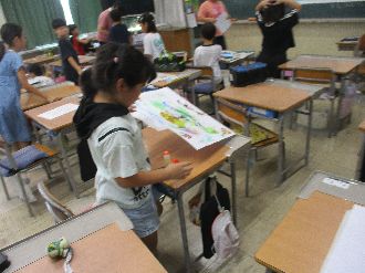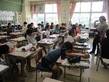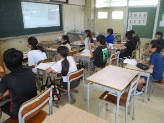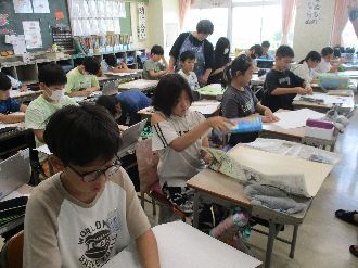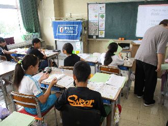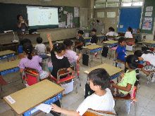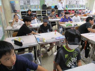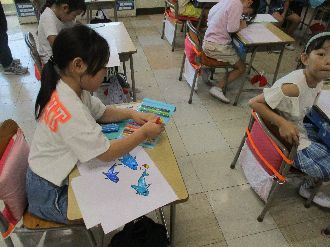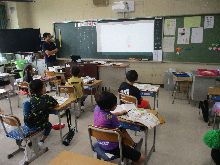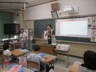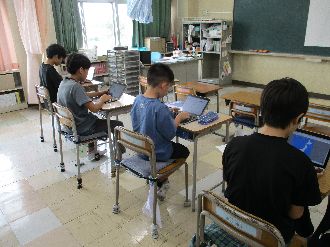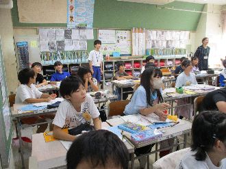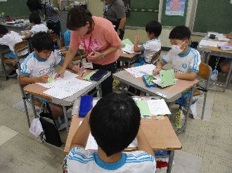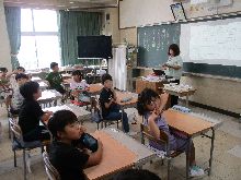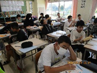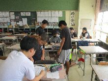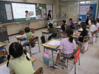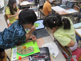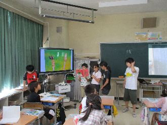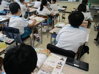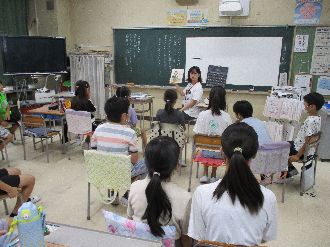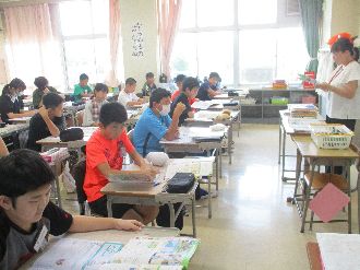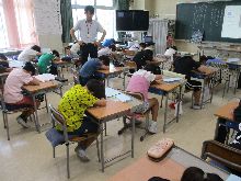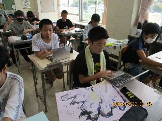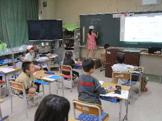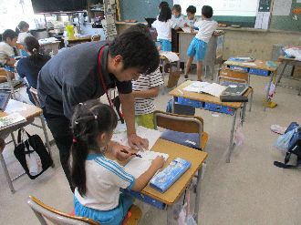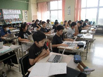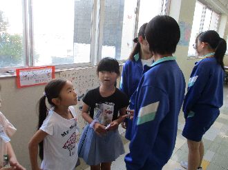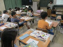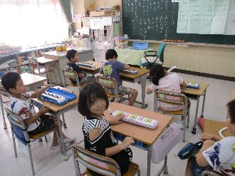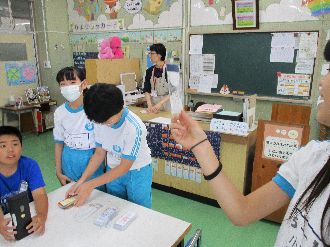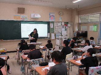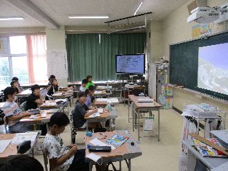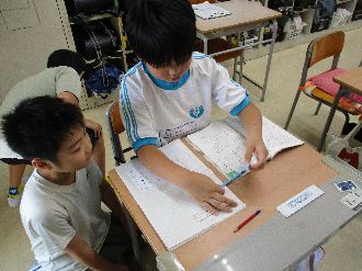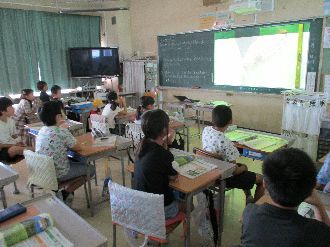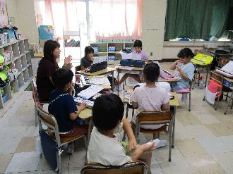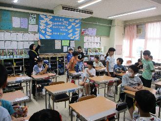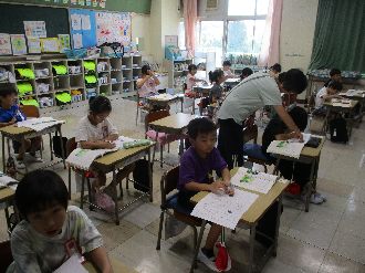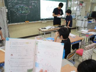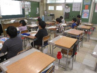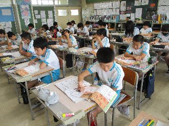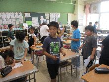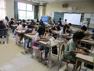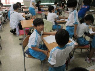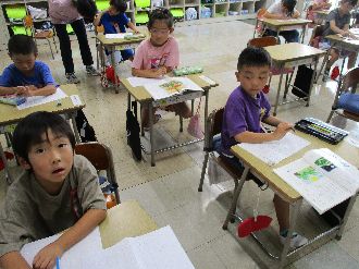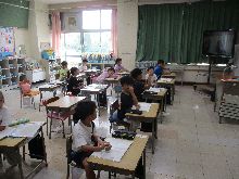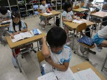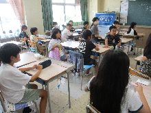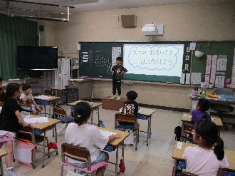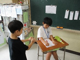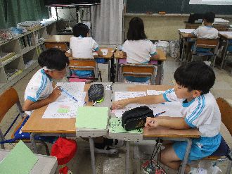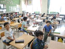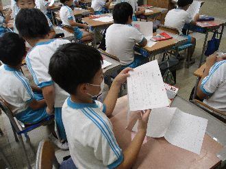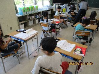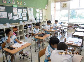 3年生は算数の少人数学習です。たしかめ算について確認していました。まずは習った足し算のたしかめ算です。すると今習っている割り算から一気に難易度がさがったようで「余裕じゃん」と声が聞こえてきました。一度習った事に自信をもって答えを出し、新しいことに生かすこと、これが大事であるし子どもの自信にも繋がるのだなぁと思っていました。1年生が国語の学習で夏の出来事を文章にし、絵を添えて発表するようです。面白かったこと伝えたいことがあるのでしょうね、黙々と集中し取り組んでいました。リアルな体験活動で得たことは心に強く残るのだなと思ってみていました。2年生が漢字の学習で2文字の熟語について考えていました。「バラバラに読むと何となく意味が分かる気がする」なんて鋭い発言をしていた子がいました。多くの子が「朝市」という熟語の意味が解らなかったようですが、その中である児童が「いちっていちばのいちじゃない?」なんて発言が!ここから「そうか!あさのいちばなのかな?!」と別の子「あ~そっか」「へ~」何て素敵なつぶやきたちなのでしょう。私は「アッパレ!」といって教室を後にしました。