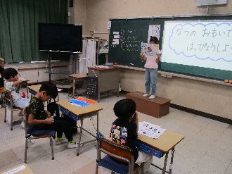 1年生が夏の思い出を発表してました。これまで一生懸命作成したメモやスケッチをつかって、まずは一人で練習です。上手な発表の仕方を意識して練習する姿がほほえましかったです。その後、グループで練習をし、今後は相手の話を上手に聴くことにも意識を向けていました。なかなか難しいことをしています。それでも上手な話の聴き方の意識をもってお友達の話が聴けました。一人ひとり全員が皆の前で堂々と発表し、お友達の発表にしっかりと耳を傾け質問をする姿に、入学してきたばかりの4月から、たった半年ですが大きく育ったなぁと感じました。