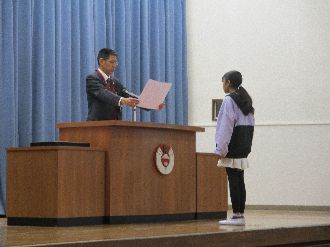 冬休みはこれまでの体験で感じたことや成果物をもとに、「なりたい自分」になるために何をすべきか考え、具体的な計画を立てて欲しいと思います。計画は、「1日15分読書をする」「毎日1キロ走る」など、数字を入れると実行しやすくなると言われていますので、是非参考にしてください。また、3年生と6年生の代表児童が2学期の振り返りを行いました。どちらも立派に発表でき、大変立派でした。その後は表彰を行いました。とてもたくさんの児童が受賞しており、努力した成果を改めて感じることができました。その後、生徒指導主任から冬休みの過ごし方について「も・ち・つ・き」それを「や・く・よ」の話がありました。楽しく有意義なお休みとなるように、また安全・安心に過ごせるように、ご家庭でも話題にしてください。