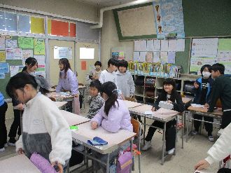 1年生のダンスの本番でした!可愛い大爆発です。全てのグループに花丸!2年生の音楽、グループごとに斉唱していました。3つの内1つは見られなかったのですが歌声と笑顔に「惚れてまうやろ~」と叫んできました。3年生は困っている人を助けるロールプレイをしていました。優しい言葉にかけた側もかけられた側も見ている側もみな笑顔になる時間でした。4年生の教室に見沼代用水が出来上がっていました。その中でたくさん手を挙げにぎやかに学びを進める子ども達、私も魚になりきって泳いでみました。5年生の調理実習にお邪魔しました。日頃よりお家でお手伝いをして料理を作っているという子たちのテーブルで少し早いランチのおこぼれをいただきました。鍋で炊いたご飯と大根とネギと油揚げのTHE味噌汁のお味が大変おいしく、会話も相まって心もあたたまりました。6年生は慈恩寺中学校のさわやか相談員さんと一緒にいのちの支え合いを学ぶ学習をしていました。友達のよい相談相手になるにはどうしたらよいかを考える時間です。相談にのる時のポイントをぜひ必要になった時に実践できるようになって欲しいと思いました。あおぞら学級でディベートが開催されていました。緊張した面持ちでピリッという空気が流れていましたが、これまでの下調べがなかなか素晴らしく、何事も準備が大切であるなぁと思っていました。